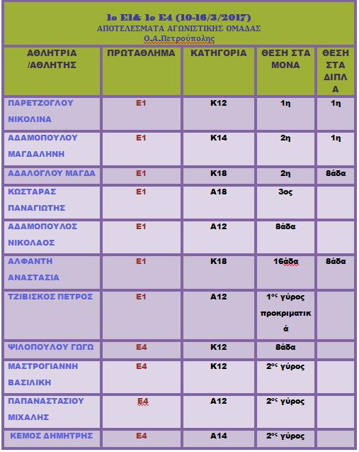 1ο Ε1 & Ε4 2017 και ο Ο.Α.Πετρούπολης συνεχίζει τις αγωνιστικές επιτυχίες του, κατακτώντας 3 ΠΡΩΤΕΣ ΘΕΣΕΙΣ, 2 ΔΕΥΤΕΡΕΣ ΘΕΣΕΙΣ και 1 ΤΡΙΤΗ ΘΕΣΗ. Με τις πολύ καλές εμφανίσεις που πραγματοποίησαν ΟΛΟΙ οι αθλητές μας, επιβεβαίωσαν ότι μπήκαν με το «δεξί» στις φετινές αγωνιστικές τους υποχρεώσεις. ΣΥΓΧΑΡΗΤΗΡΙΑ ΣΕ ΟΛΟΥΣ ΤΟΥΣ ΑΘΛΗΤΕΣ ΜΑΣ ΠΟΥ ΣΥΜΜΕΤΕΙΧΑΝ!!!