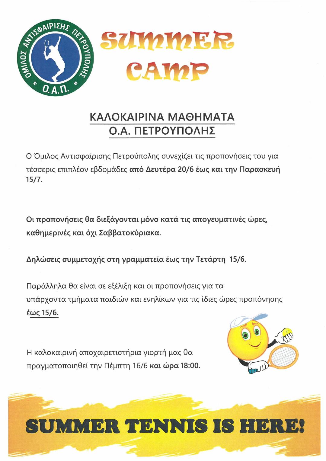 Ο Όμιλος Αντισφαίρισης Πετρούπολης συνεχίζει τις προπονήσεις από Δευτέρα 20/6 έως Παρασκευή 15/7.Δηλώσεις συμμετοχής στη γραμματεία έως 15/6.Παράλληλα οι υπάρχουσες προπονήσεις θα είναι σε εξέλιξη έως 15/6.