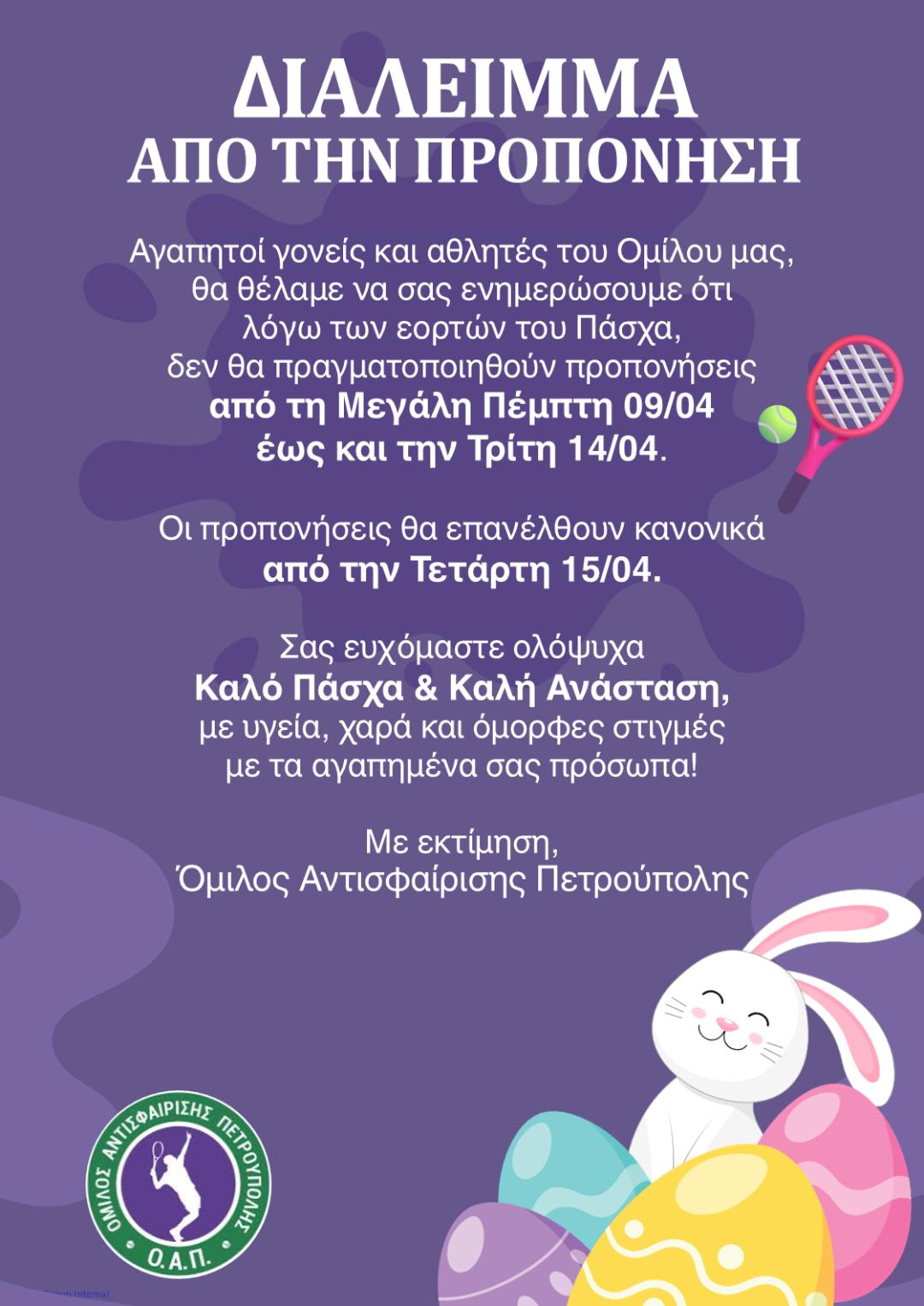 Σας ενημερώνουμε ότι κατά τη διάρκεια των εορτών του ΠΑΣΧΑ ο Όμιλος Αντισφαίρισης Πετρούπολης δεν θα πραγματοποιήσει προπονήσεις από τη Μ.Πέμπτη 9/4/2026 .Έναρξη μαθημάτων Τετάρτη 15/4/2026.